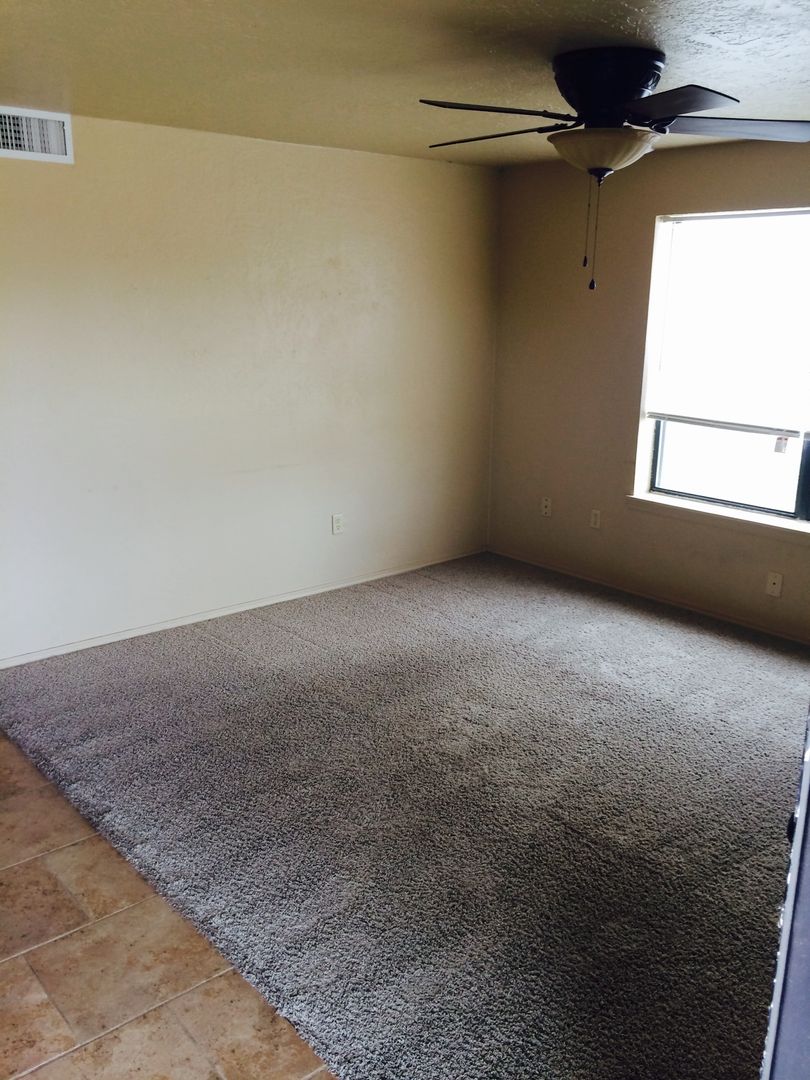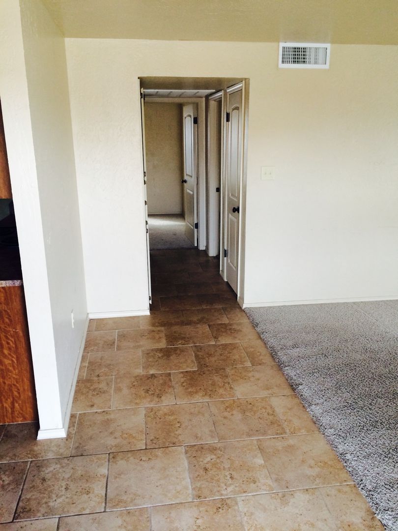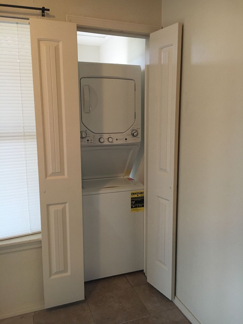 Water PAID!! Large 980 sq. ft. 2 bedrooms, 1 bathroom quadplex, carpet, tile, refrigerator, stove, microwave and dishwasher, stacked washer & dryer in unit.